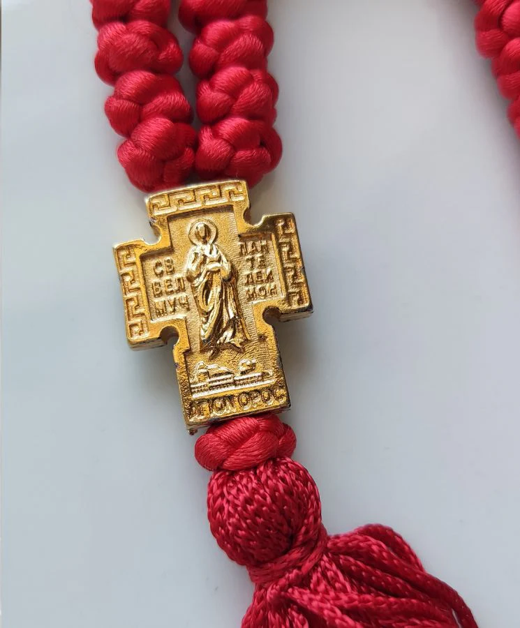 Mount Athos Waxed Prayer Rope with 50 Knots, Gold Embossed Cross & Tassel – Red