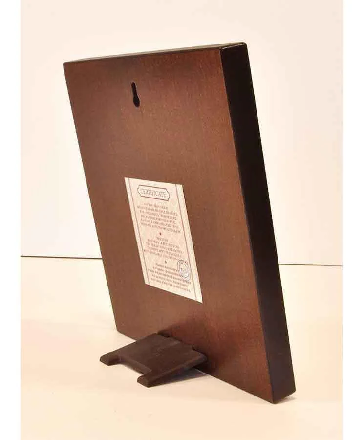 Aged seriograph icon crafted in canvas on carved wood. The halo of the image is silver plated locally gilded.